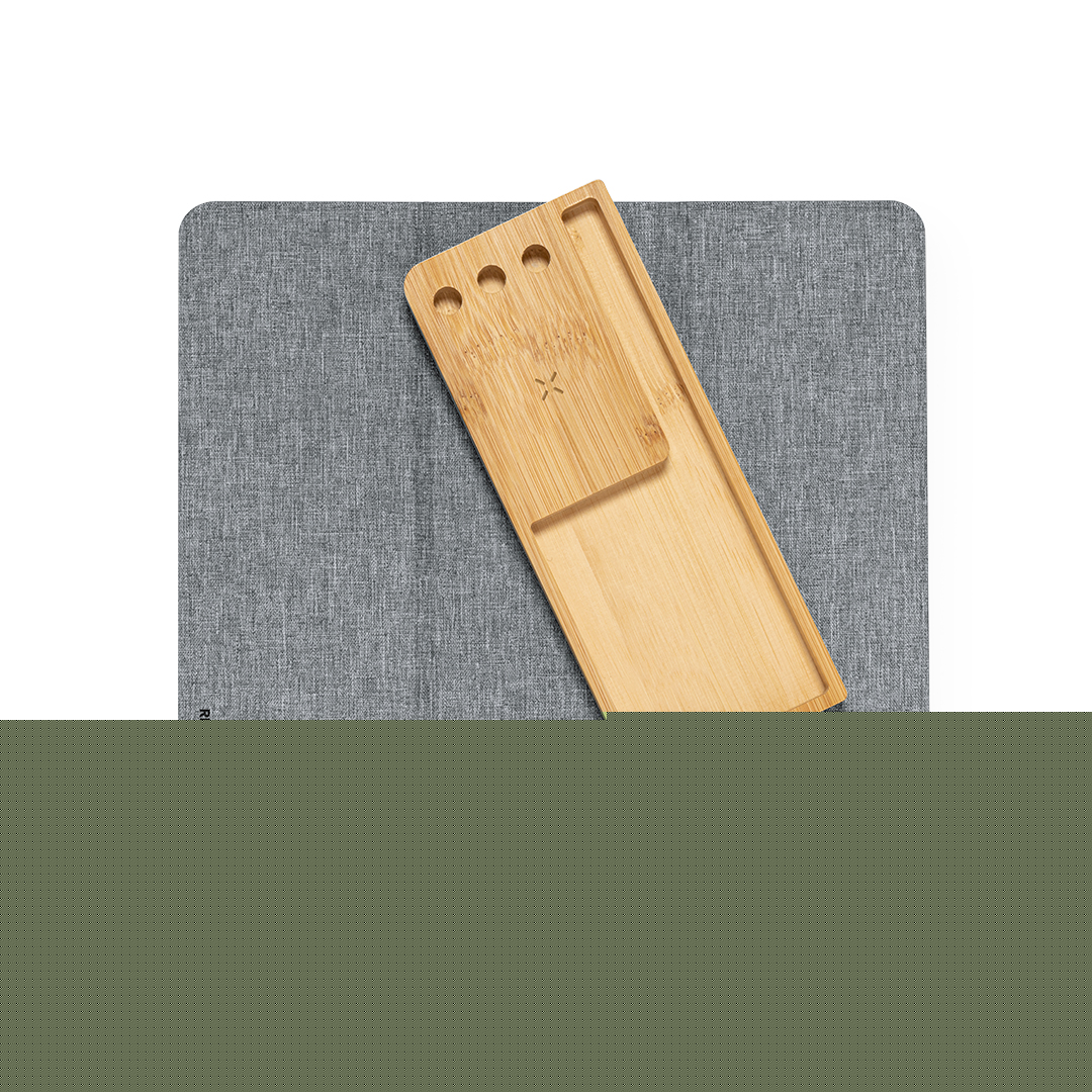 Elegante y funcional afombrilla plegable fabricada en combinación de suave poliéster RPET y bambú. Con entrada tipo C -cable negro Tipo C incluido- y cargador inalámbrico de 15W,compatible con dispositivos equipados con tecnología de carga inalámbrica Qi. Incluye soporte para smartphone, soporte para bolígrafos, y compartimento libre de almacenaje en bambú. Base antideslizante que garantiza un uso cómodo y estable.Incluye manual de uso en en español e inglés. Presentada en caja individual de diseño kraft y en bolsa reciclada.El material RPET se elabora a partir de plástico reciclado, para así fomentar la reutilización de residuos plásticos y ayudar a la sostenibilidad del planeta.En cumplimiento con los requisitos de seguridad: Sistema de protección contra sobrecalentamiento. Sistema de protección contra sobrecarga. Sistema de bloqueo para evitar cortocircuitos. Plegable. Cargador Inalámbrico 15W. Antideslizante