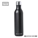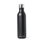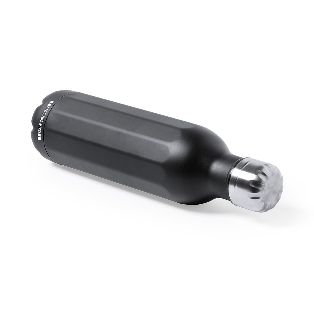 Bidón en acero inox de Antonio Miró. De 750ml de capacidad y sobrio acabado en negro satinado, con cuerpo prisma y logotipo de la marca en la base. Con tapón cromado a rosca y presentado en atractiva caja de diseño con logotipo de la marca. 750 ml