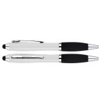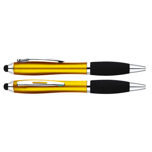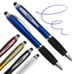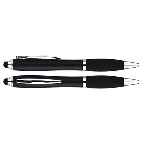 Bolígrafo de cuerpo metalizado empavonado plástico con soporte engomado y puntero touch.