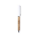 Bolígrafo de línea nature en combinación de corcho natural y metal. Con original clip metálico de acabado cromado, a juego con la punta y la anilla. Parte superior en color blanco, de mecanismo giratorio y con tinta azul. Presentado en caja individual de diseño eco.