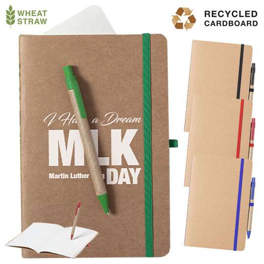 Set de libreta y bolígrafo de línea nature. Incluye libreta en cartón reciclado, con soporte para bolígrafo y cinta de cierre a juego, de 60 hojas lisas. Bolígrafo de mecanismo pulsador, con cuerpo en cartón reciclado y accesorios en caña de trigo -tinta azul-. Distintivo Wheat Straw en la parte superior del bolígrafo. 60 Hojas. Bolígrafo Cartón Reciclado/ Caña de Trigo/ ABS Incluido