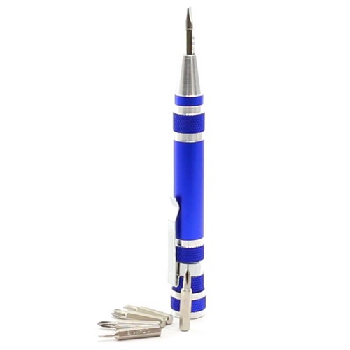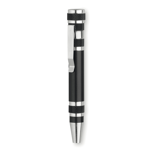 Multiherramienta de aluminio de 6 accesorios en variada gama de vivos colores metalizados. Con cuerpo anti deslizante y clip metálico. Incluye 6 cabezales destornilladores planos y de estrella. 6 Accesorios