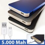Batería externa rectangular metálica de aluminio en diferentes colores con terminaciones plateadas. Capacidad de 5.000 mAh. Presentado en estuche de cartón negro con funda laminada.