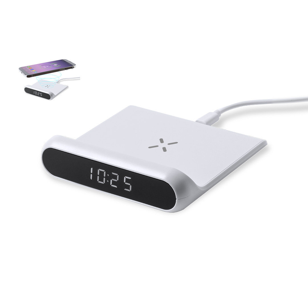 Reloj multifunción con pantalla retroiluminada y cargador inalámbrico 10W integrado. De elegante diseño en color blanco, con funciones hora y alarma. Cable de carga Tipo C de 1 m incluido y compatible con dispositivos equipados con tecnología de carga inalámbrica Qi. Presentado en caja individual de diseño kraft, con manual de instrucciones en español en inglés.Fabricado conforme a los estándares RoHS y en cumplimiento con los siguientes requisitos de seguridad:Sistema de protección contra sobrecalentamiento.Sistema de protección contra sobrecarga.Sistema de bloqueo para evitar cortocircuitos. Inalámbrico 10W. Conexión USB
