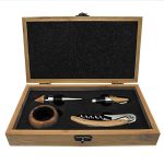 Set de vino en caja de bambu que incluye sacacorchos, tapon hermetico para vino, argolla anti-goteo y recoge-gotas. Presentacion en caja de carton duro negra. Accesorios de acero inoxidable y madera bambu.